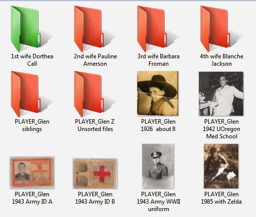 “The folders are colored RED if I haven't finished working on what I've collected digitally. Once each item within a folder is attached to the appropriate ancestor, the folder to changed to GREEN.”